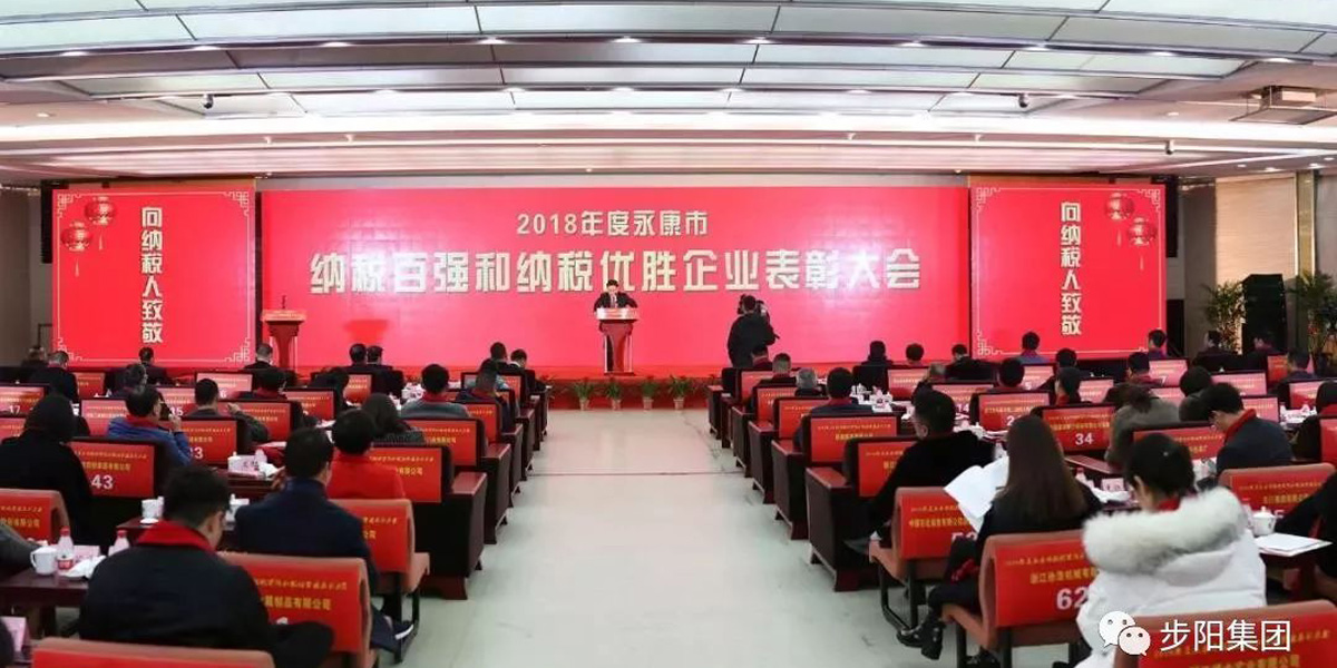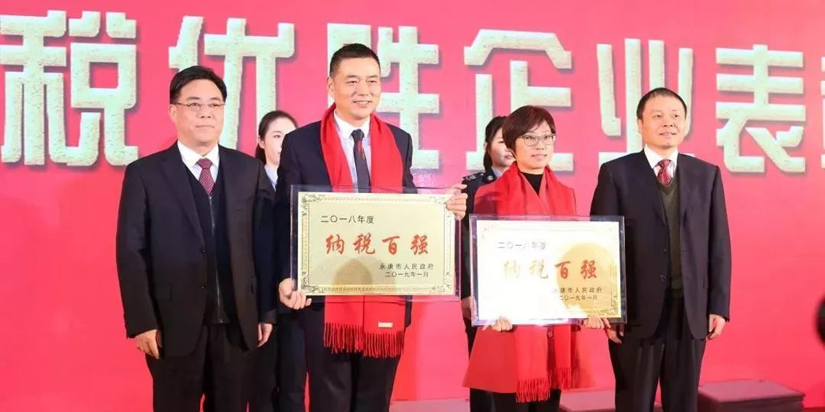 2019年1月24日,“2018年度永康市納稅百強和優勝企業表彰大會”在國際會展中心隆重舉行。蘑菇视频污下载集團再次位列年度永康市納稅百強企業榜首,全年上交國家稅收總額達4.33億元,其中永康區域達到了2.38億元,突破了蘑菇视频污下载曆史最高水平,繼續成為永康市名列前茅的納稅大戶。被永康市人民政府授予“2018年度永康市納稅百強企業”稱號,蘑菇视频污下载集團董事長徐步雲出席表彰大會並發言。